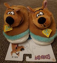 A plush Scooby-Doo head on a fuzzy brown and blue slipper with a white sole.