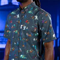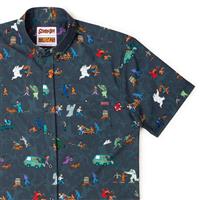 RSVLTS Behind You Short Sleeve Button-Down Shirt. The chasers become the chasees on this creepily kinetic Kunu featuring the Mystery gang running from iconic ghosts and goblins – aka salty locals who have nothing better to do than scare an entire town. Grab this shirt and don’t look back! Sold for $70.00.