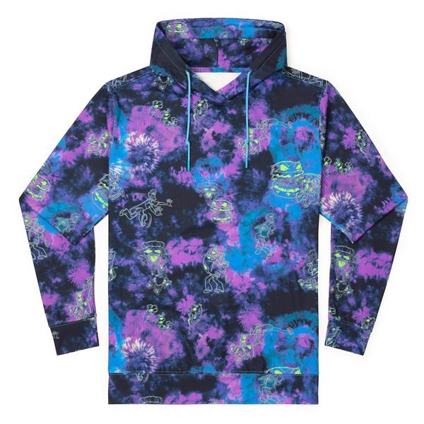 RSVLTS Zoinks!!! Performance Hoodie. Slim fit. Size up for a more relaxed look. Shaggy™, Scooby-Doo™, even The Burger Monster™ on a dark, cosmic, tie-dye design that GLOWS IN THE DARK UNDER UV LIGHT? Zoinks! That's, like, a whole lotta hoodie. If you're looking to be like Mystery Inc.™, and find yourself in haunted house after haunted house... glow-in-the-dark gear isn't a bad idea. Sold for $67.00.