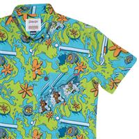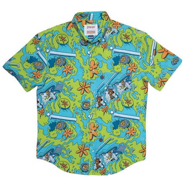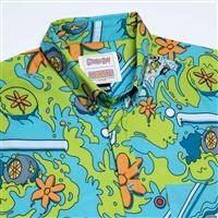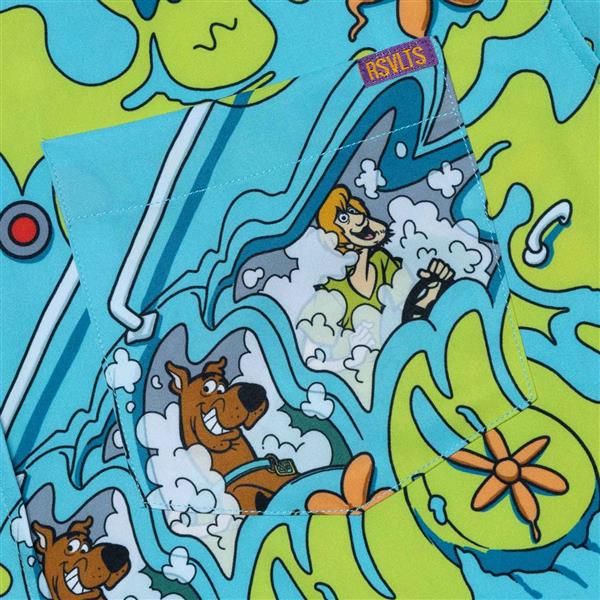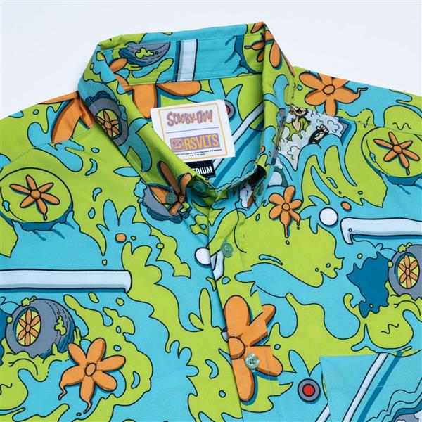 RSVLTS Road Trippin Short Sleeve Button-Down Shirt. It's mean, it's green, it's the Mystery Machine! Adorned with elements from the Mystery Machine like tires, headlights, taillights, and the iconic flower, this '60s-looking KUNUFLEX™ button down is a trip. Funky, psychedelic, even downright flower-powered, take a ride in this soft, stretchy tribute to Mystery Inc.'s main wheels. Sold for $70.00.