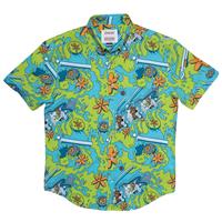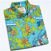 RSVLTS Road Trippin Short Sleeve Button-Down Shirt. It's mean, it's green, it's the Mystery Machine! Adorned with elements from the Mystery Machine like tires, headlights, taillights, and the iconic flower, this '60s-looking KUNUFLEX™ button down is a trip. Funky, psychedelic, even downright flower-powered, take a ride in this soft, stretchy tribute to Mystery Inc.'s main wheels. Sold for $70.00.