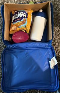 2002 Blue Thermos brand lunchbox with Scooby-Doo on the front. Comes with cup, Pringles container, and snacks.